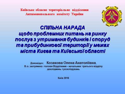 За ініціативою Київського обласного територіального відділення Антимонопольного комітету України 16 травня поточного року проведено спільну нараду з представниками місцевих органів державної влади, органів місцевого самоврядування, представниками співвласників багатоквартирних будинків, ОСББ та ЖБК щодо проблемних питань, які виникли на ринку житлово-комунальних послуг, в тому числі під час ціноутворення на послуги з утримання будинків і споруд та прибудинкової території у межах міста Києва та Київської області та шляхи їх вирішення.